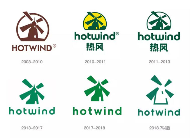 最新的LOGO繼續保留了風車圖形,但相比前面的五個版本,此次調整對圖形的優化幅度最大。可以從下面的歷史演變中看出,從2003年推出風車形象后,幾次調整的過程均圍繞此形象進行,其中2010年至2013年這段時間還增加了黃色的背景配色,風車的左右增加了一些裝飾元素。