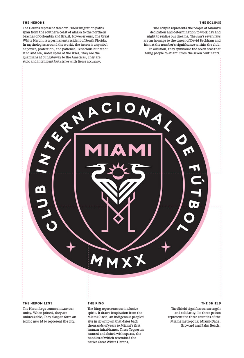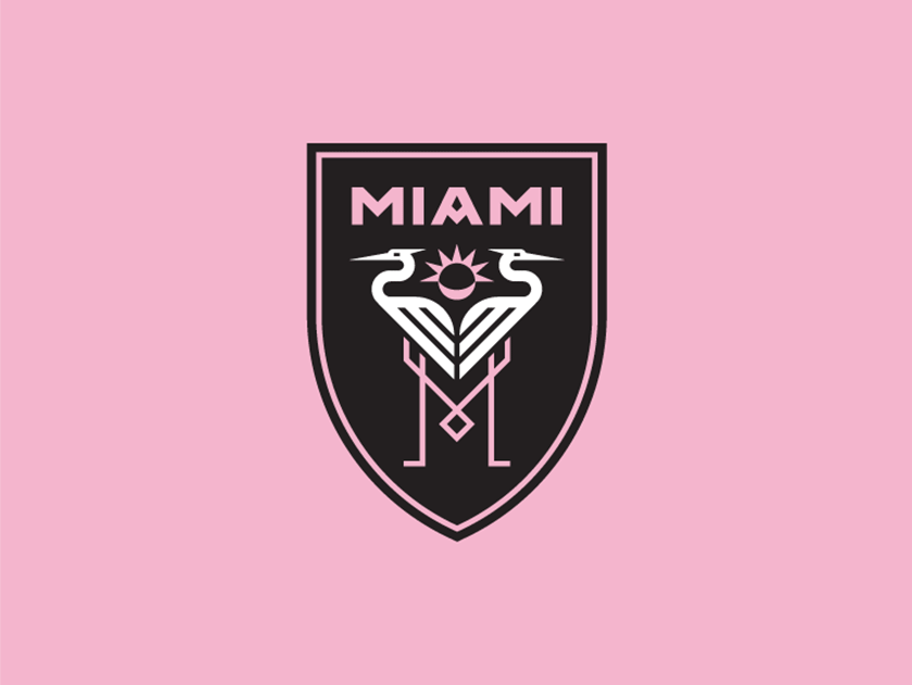 國際邁阿密的LOGO以黑色和粉色為背景,兩字蒼鷺背靠背站立著,背景是日食。俱樂部的座右銘是Libertas,Unitas,Fortuna,意思是所有人自由、團結包容和好運的概念。