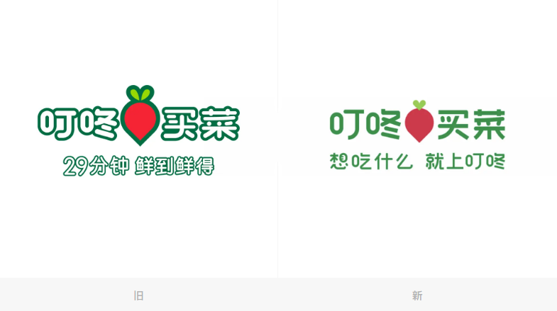 去掉輪廓描邊后,紅蘿卜顯得更加圓潤肥碩,兩片綠色的蘿卜纓連接在一起,形成一個(gè)綠色的心形符號。品牌口號也從之前的「29分鐘鮮到鮮得」變更為「想吃什么 就上叮咚」。個(gè)人理解的是,前者強(qiáng)調(diào)高效率的便利購物體驗(yàn),后者則囊括了生鮮美食等滿足各類家庭生活所需的產(chǎn)品。