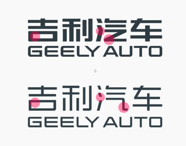 除了圖形符號的創新設計,吉利還更新了品牌字標和品牌色。其中字體的設計更純粹,和其新的圖標一樣,中英文字體在保留原始字形的前提下,讓筆畫變得更細,還將「汽」字連在一起的「氵」分開,使其疏密有序,更利于閱讀。
