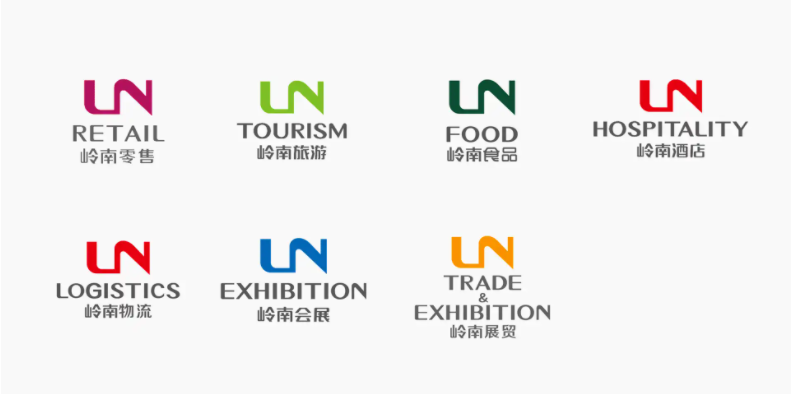 集團旗下的子品牌采用了與集團一樣的「LN」連字圖標,不同的是,子品牌的圖標以不同的顏色區分,并且沒有紅色的旗幟圖形背景。