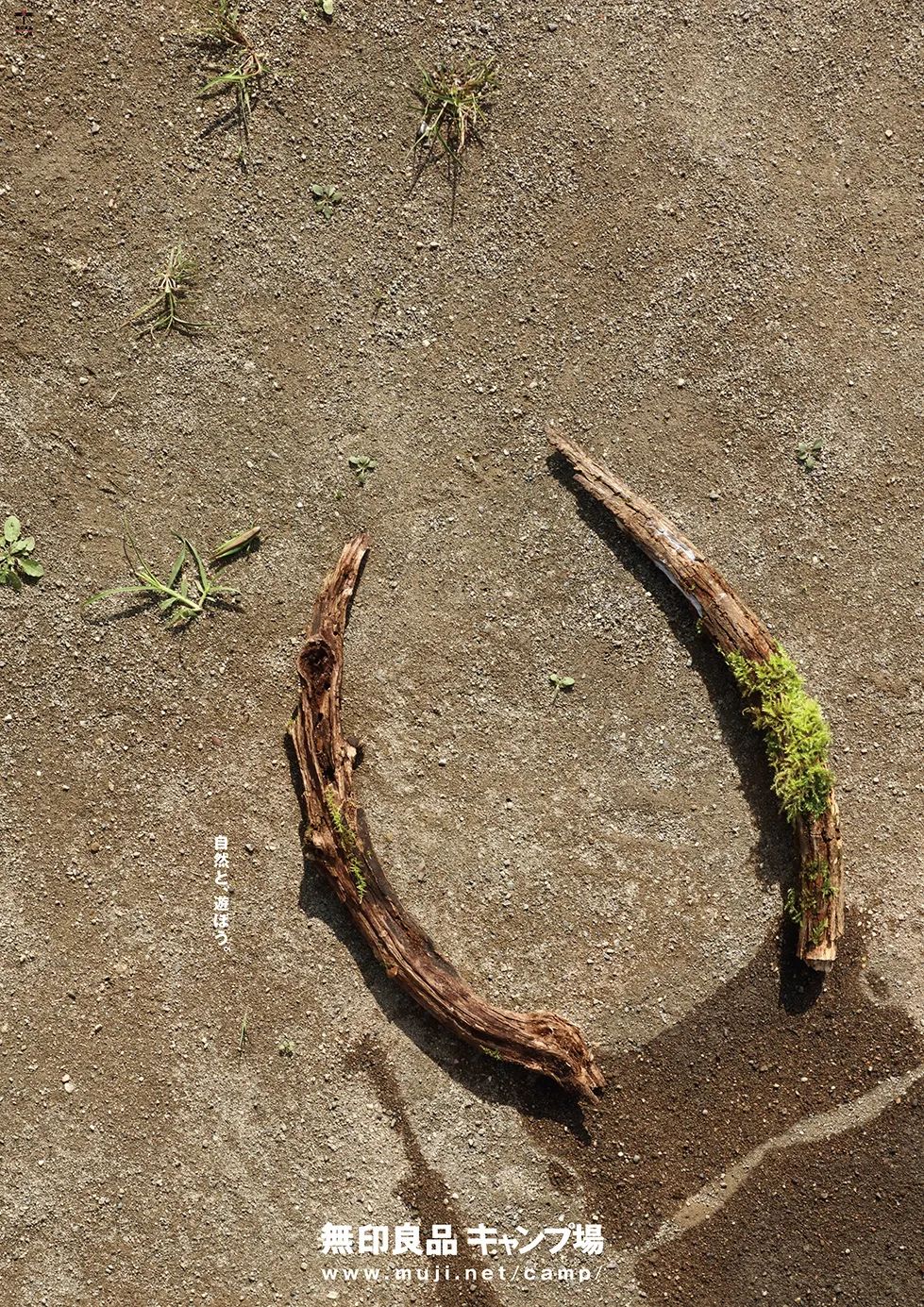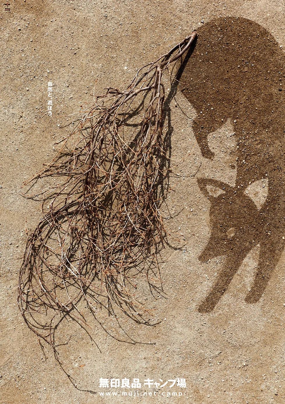 2022年無(wú)印良品露營(yíng)場(chǎng)最新主題海報(bào),以“自然と、遊ほう。”(與自然游玩)為主題。透過(guò)用水在地上噴出的陰影與樹枝,巧妙地勾勒出了鹿、狐貍和鹿角蟲等質(zhì)樸又帶有童趣的形象。