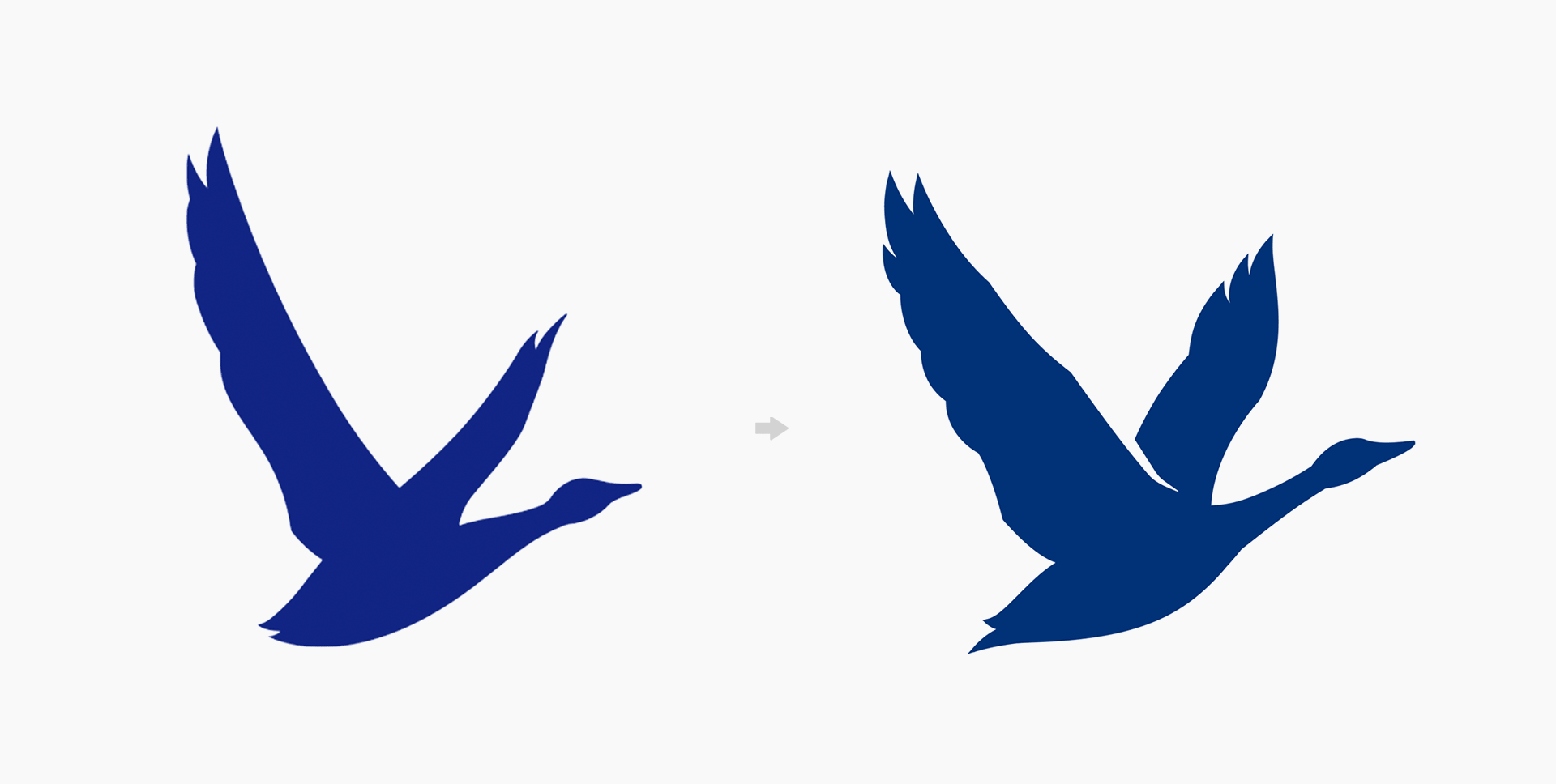 除了大雁數量增加外,每個大雁的剪影輪廓也進行了更細致和生動的刻畫。就拿新舊LOGO中的兩只深藍色大雁來說,新的大雁翅膀上的羽毛更豐富,脖子伸長了,尾巴翹的也更自然。