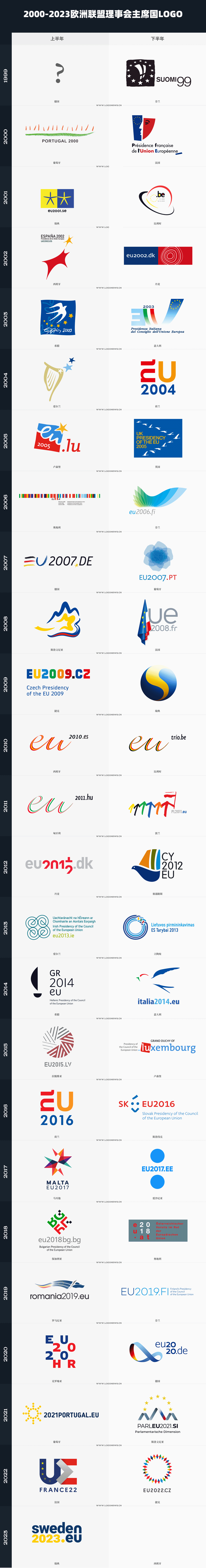 下圖為2000-2023歐洲聯盟理事會主席國LOGO: