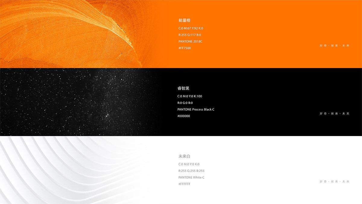 升級后品牌主色調繼承原有的橙色系,并提升色彩亮度,增添更多活力與能量。主色調“能量橙”,搭配“睿智黑”和“未來白”兩種輔助色彩,三者和諧搭配,共同構成了圖拉斯品牌色彩系統,同時也對應展現品牌理念“好奇、探索、未來”。