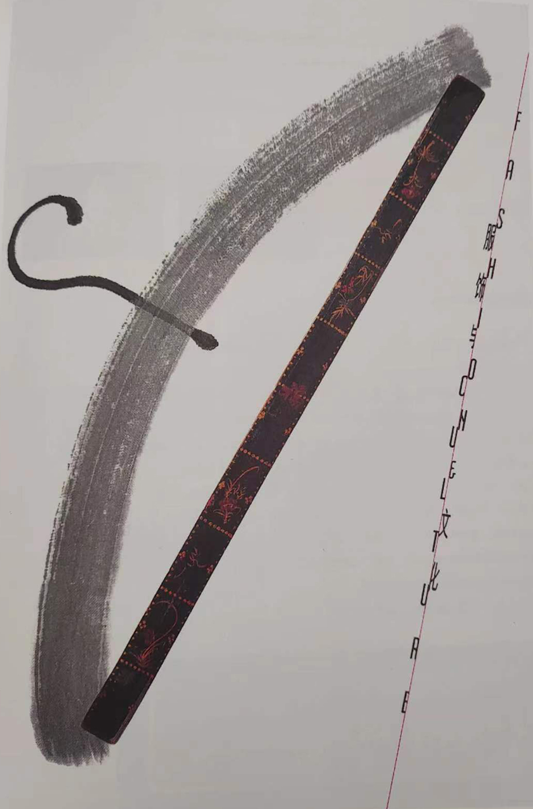 為了表現文化主題,以一把漆繪的竹尺表現服飾與文化的密切關系。尺子是生活中常見的線的形象,再加上與水墨組成的圓弧線與勾狀的自由線,組合成衣架的圖像。中英文標題的處理上,運用了以短線組成的虛線,象征縫紉機縫制成的直線,突出了服飾的主題。