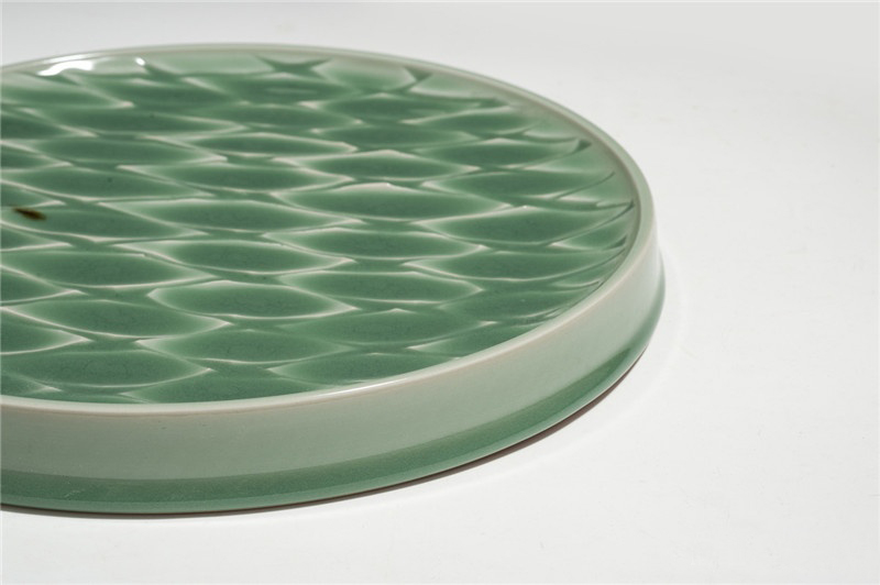 ▲ “格子”青瓷盤,運用陽刻雕琢格子的紋路,通過有色的厚薄呈現深淺不一的色澤和質感,仿佛是波光粼粼的水面反射著陽光。