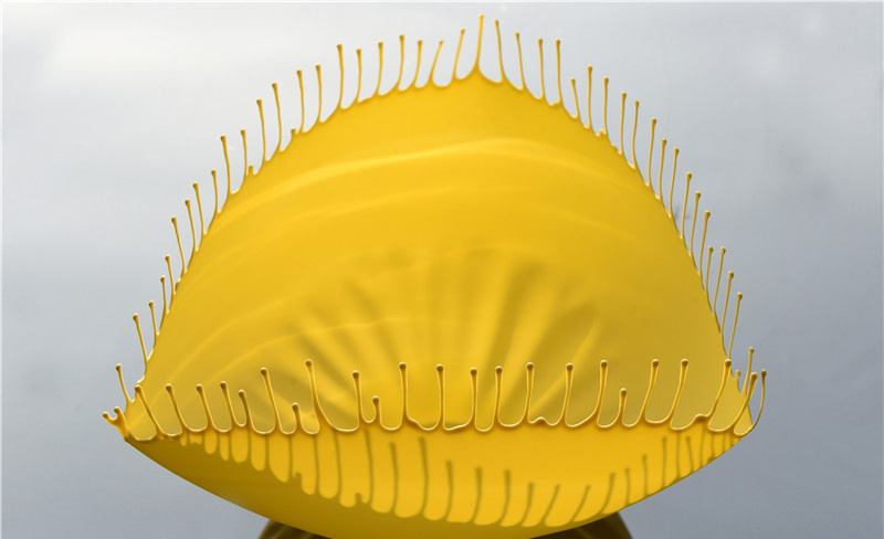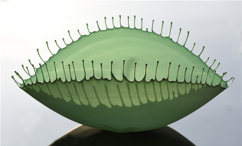 玻璃,是對于東方視覺世界的象征,即,它不是一種固體,而是一種高度黏稠的液體,即使它看起來具有形體,實際上是欠缺和難以捉摸的,甚至光的加入也不能發揮它的作用。卞曉東的瓷器,以薄如蟬翼的薄胎瓷表現了一個破繭成碟后的蠶繭,胎體上的褶皺與濺出的須柱是模擬小小個體在蛻變前迸發的強大力量,代表蛹從繭中出現的瞬間,一種變化的形態,不是雕刻石頭,而是水的跳躍。