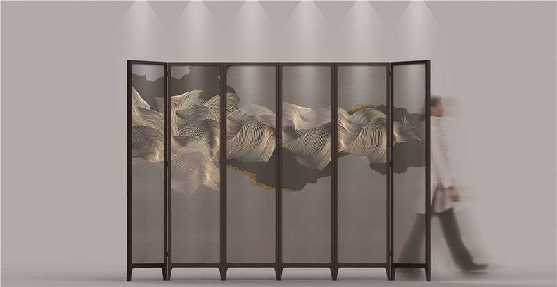 ▲ 水韻系列雙面繡落地屏風,由馬聰創作,以抽象簡約的云水紋樣,結合中國非物質文化遺產——雙面繡手工藝,或為波浪狀,似水流動,或為云團狀,似隱似現,以其飄逸靈動、回轉交錯的結構表達了東方美學“疏密有致”的意境美感和“虛實有度”的審美張力。